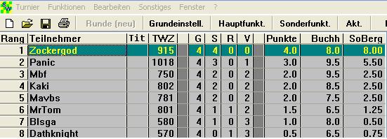 Zockergod(3) vs Kaki(2) 1-0 PaniC (2) vs Mbf (2) 1-0 MrTomm(2) vs Mavbs (1) 0-1 Dathknight (1) - Blasga (0) 0-1 so hier hab ich ein screenshot angehängt von der endtabelle, das siegertreppchen wurde wie folgt belegt: 1. Zockereumel 2. Panic 3. Mbf die feinwertung erfolgt über die sogenannte Bucholzwertung, welche die punkte der gegner zusammen addiert, gegen die man aktiv wurde und somit ein maß über den widerstand den man im turnier erfahren hat gibt. hohe buchholz = besser also im großen und ganzen lief das turnier sehr zügig und man kann es als erfolg betrachtet. ich hatte einige probleme noch mit dem programm, da ich einen spieler nachträglich entfernen musste, daher sind die 0,5 werte von Mrtom und dathknight falsch da dort ein ganzer stehen müsste. im endeffeklt lohnt sich das turnierprogramm erst bei einer höhreen teilnhemerzahl (15+) und entfaltet dann erst siene voll wirkung. naja es war ja auch erst ein probeturnier und ich fand den testverlauf positiv. Geändert von Zockergod (18-05-2006 um 20:58 Uhr). |