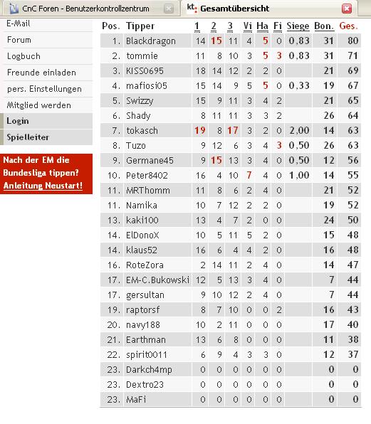 Von den letzten Ständen hab ich mal Screenshots gemacht und hier angefügt. Da kann dann noch mal jeder sehen, wo er stand und wie sein letztes Spiel ausgegangen ist. Raptorsf, ich hab noch immer nicht deine Anschrift. Willst du deinen Preis nicht? Die Mitglieder habe ich alle gelöscht. Unter diesem Account habe ich ein Tippspiel für die Championsleague aufgemacht. Achtet auf den gesonderten Thread, den ich gleich eröffnen werde. Um mitzuspielen müsst ihr euch dann ganz neu anmelden. Danke noch einmal an alle, die mitgespielt haben. Die Spiele sind zu Ende - mögen die neuen Spiele beginnen. ![]()