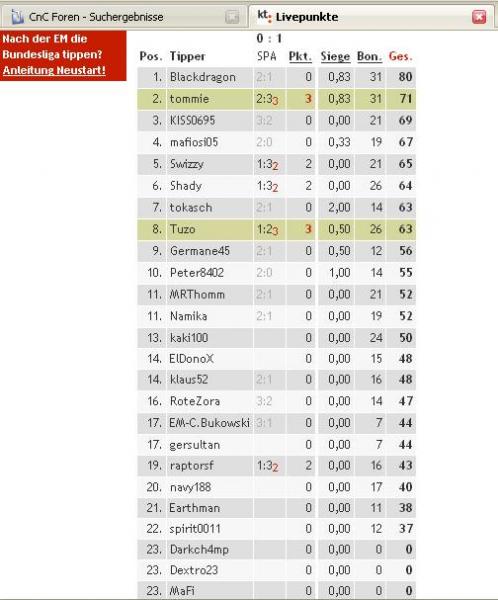 Von den letzten Ständen hab ich mal Screenshots gemacht und hier angefügt. Da kann dann noch mal jeder sehen, wo er stand und wie sein letztes Spiel ausgegangen ist. Raptorsf, ich hab noch immer nicht deine Anschrift. Willst du deinen Preis nicht? Die Mitglieder habe ich alle gelöscht. Unter diesem Account habe ich ein Tippspiel für die Championsleague aufgemacht. Achtet auf den gesonderten Thread, den ich gleich eröffnen werde. Um mitzuspielen müsst ihr euch dann ganz neu anmelden. Danke noch einmal an alle, die mitgespielt haben. Die Spiele sind zu Ende - mögen die neuen Spiele beginnen. ![]()