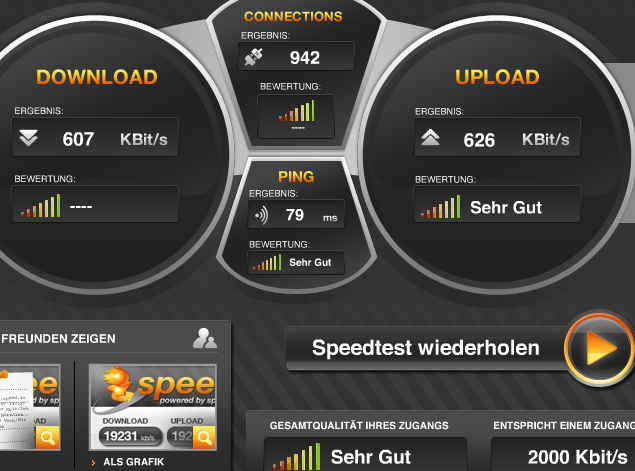 Was mich wundert das die Uploadgeschwindigkeit ungefähr genauso groß ist. Ich habe mit anderen Speedtest ähnliche Ergebnisse zu unterschiedlichen Zeiten. Wie kann es sein das die Uploadgeschwindigkeit in etwa DSL6000 die Downloadgeschwindigkeit nicht mal DSL1000 ist (laut anderen Test`s). Geändert von Sven (22-04-2011 um 13:58 Uhr). |