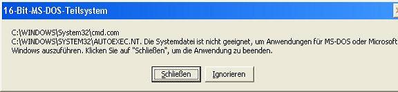 Über Start -> Ausführen gebe ich den Befehl "cmd" ein! Für was der sein sollte ist hoffentlich klar ![]() Es erscheint dann eine sehr merkwürdige Fehlermeldung, siehe unten. System: Win XP (Home) P4 2,4 Ghz SP 1 Mehr daten braucht es wohl nicht