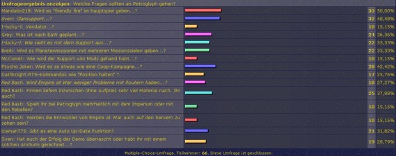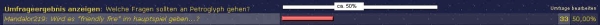 Beispiel: Bei dieser Umfrage haben 33 von 66 Usern für die Frage eins gestimmt. Richtig gerechnet es sind 50% der User die für diese Frage gestimmt haben. Ergo sollte der Balken bei dieser Frage, von der Mitte des Bilschirms bis ungefähr 3/4 des Bildschirms verlaufen tut es aber nicht sondern nur bis ungefähr 5/8, was dann ja ungefähr 25% wären. ich versuche mal das als Screenshot zu machen und einzuzeichnen.