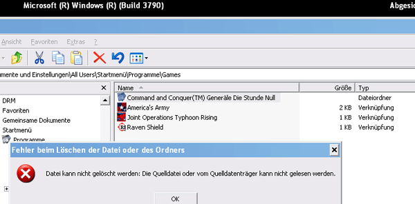 Kann mir einer genau erklären wie man das wegmacht ? mit ausführen rd kann ich wenig anfangen Ich habe den unlöschbaren ordner in "C:\Dokumente und Einstellungen\All Users\Startmenü\Programme\Stunde Null \Command and Conquer(TM) Generäle Die Stunde Null " wenn ich das löschen will bekomme ich aber eine andere meldung "Fehler beim Löschen der Datei oder des Ordners Datei kann nciht gelöscht werden: Die Quelldatei oder vom Quelldatenträger kann nicht gelesen werden. hat einer ne idee ? |