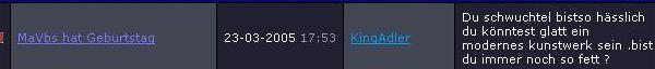 Eure letzten Beiträge hier sind mal eben so hingeschluderte Geburtagswünsche. Da ihr beide doppelt gratuliert habt, kommt es mir so vor, als wären euch eure Beitragszahlen lieber, als echte Geburtagswünsche auszusprechen. ![]() Das gibt einen Rüffel und negatives Karma von mir